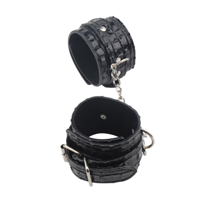 The Surrender Ankle Restraints are an eye-catching and mischievously designed ankle bracelets with a glossy surface reminiscent of crocodile skin. They are made of quality faux leather and are fully adjustable thanks to the buckle closure for a perfect fit. They have a velvety inner padding that leaves no marks or redness on the leather and are linked together by a 15 cm long, easily removable metal chain.