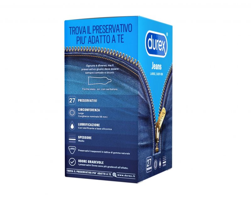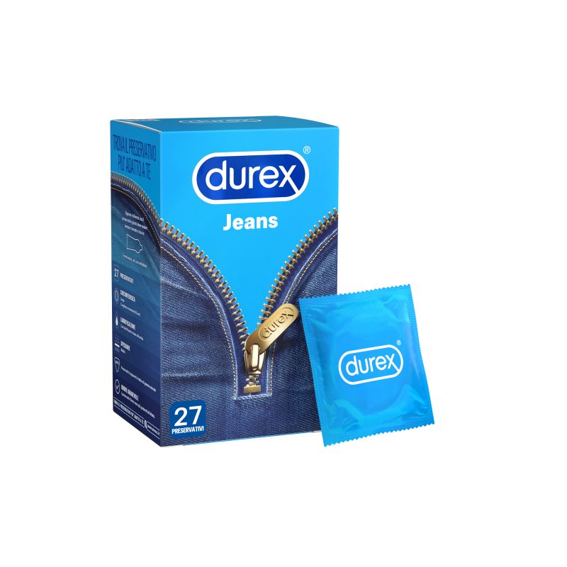 Durex Jeans: the freedom to experience sensations with great protection. These quality condoms are quick and easy to put on and thanks to their 'easy-on' shape with reservoir, they adhere perfectly to the penis without squeezing or reducing sensitivity during use. They are also pleasant to smell and offer a high level of protection with their medium thickness. They are made of natural rubber latex and lubricated with silicone-based lubricant. They have a nominal width of 56 mm. Pack of 27 dermatologically tested condoms.