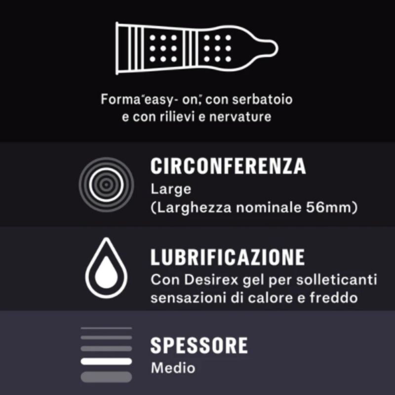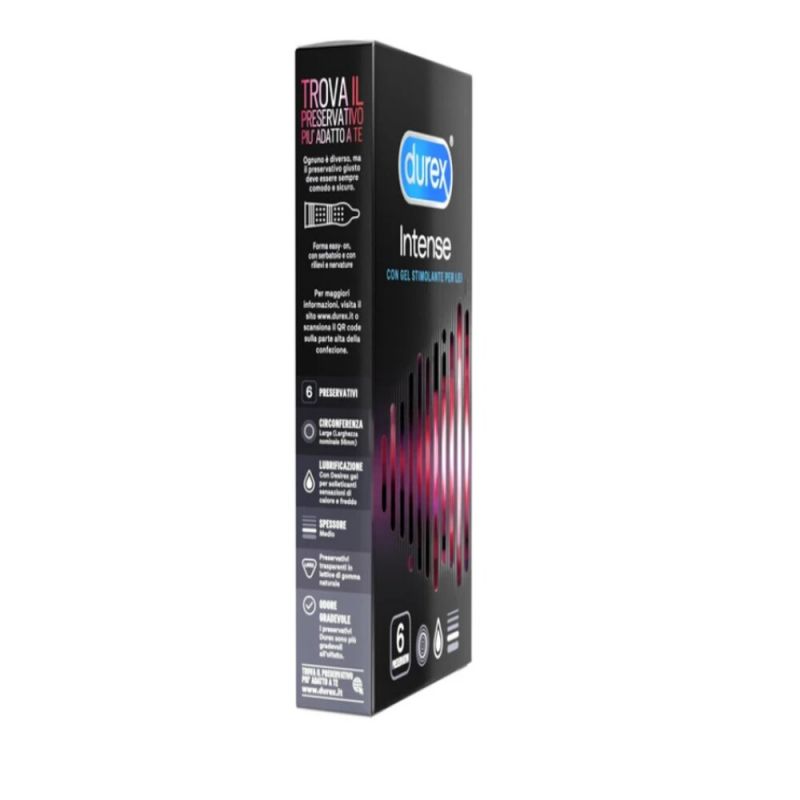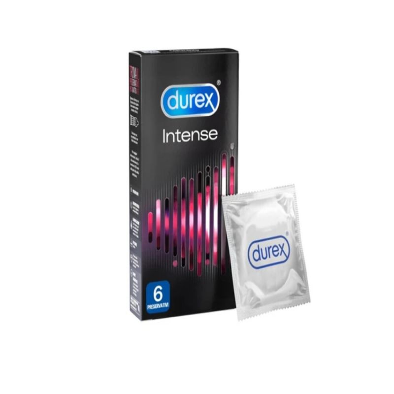 Durex Intense are natural rubber latex condoms with an easy-on shape, reservoir and pleasant smell. They are designed to offer high stimulation to the partner thanks to the presence of reliefs and ribs on the surface and lubrication with "Desirex Gel", which generates tickling sensations of heat or cold, for a superior pleasure.Pack of 6 condoms dermatologically tested and with a nominal width of 56 mm.
