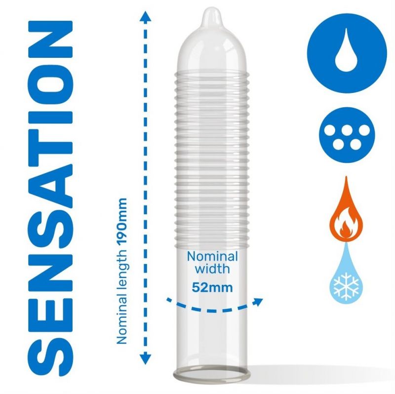 Pasante Climax are classically shaped latex condoms with a reservoir and a ribbed surface that is ideal for intensely stimulating the vaginal canal during penetration. To add to the pleasure, special warming and cooling effects provide the couple with pleasantly passionate intimate sensations. Pack of 12 lubricated, alcohol-free condoms with a nominal width of 52 mm.As well as providing unique pleasure, when used correctly they protect the woman from unwanted pregnancies and protect both partners from sexually transmitted diseases.