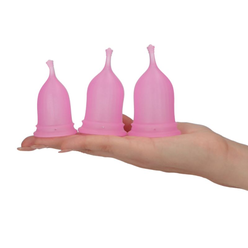 Set consists of 3 cups with different sizes: 6.8 x 4 cm; 7.8 x 4.5 cm; 8.2 x 4.7 cm. Made of Abs and hypoallergenic silicone and ideal for periods, from the lightest to the most intense days. Reusable after sanitisation.